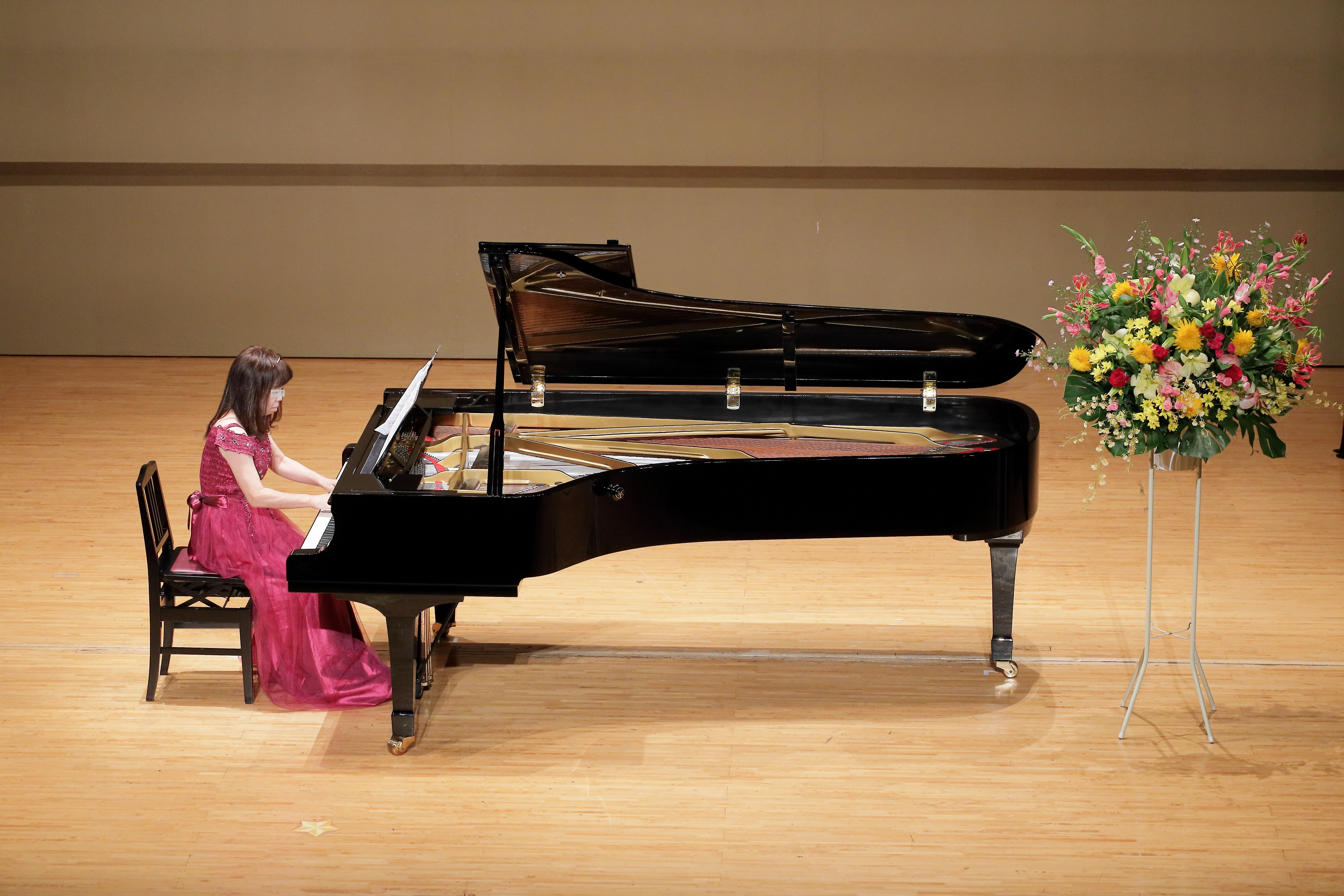 正面~右斜め前から顔の見えやすいアングルで、ピアノとお花など舞台装飾が全て収まるように撮影します。 舞台装飾の位置により撮影範囲も変わりますので、撮影当日に会場での打ち合わせにて確認いたします。