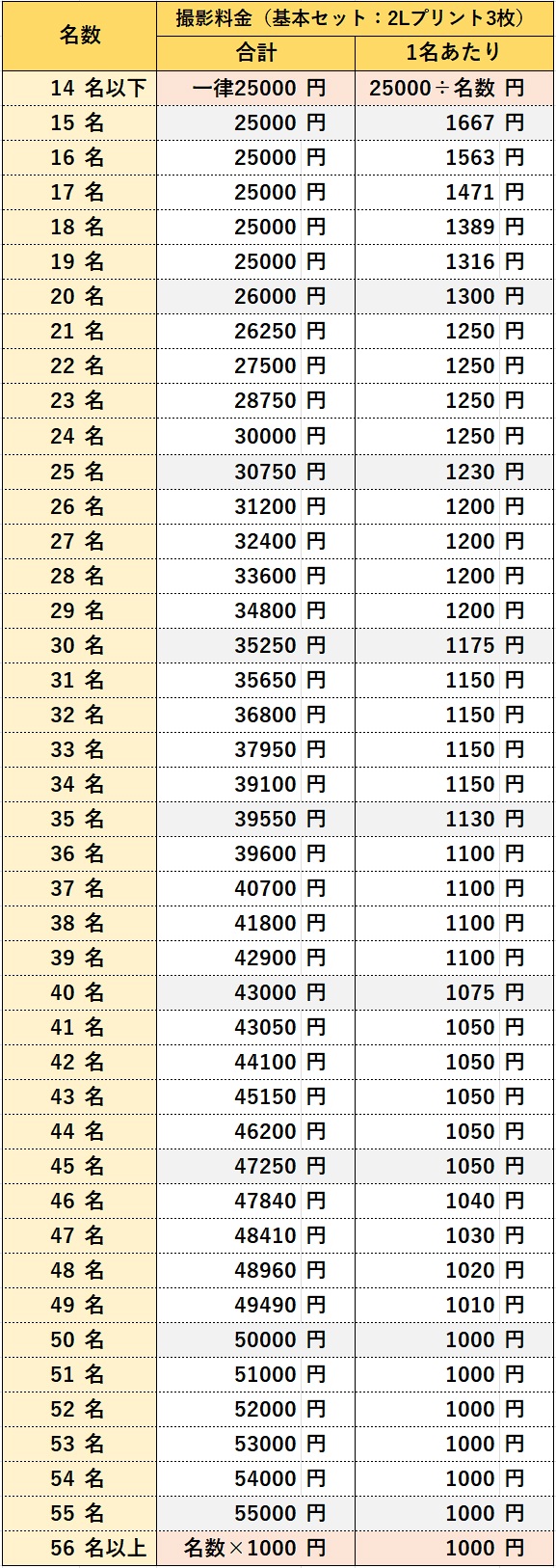 当写真館は撮影料、現像料込みでのお値段。3枚セットに仕分けをしてお渡ししております。参加人数により料金総額を算出いたします。以下の料金表をご参照ください。