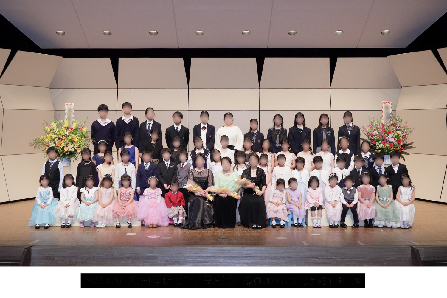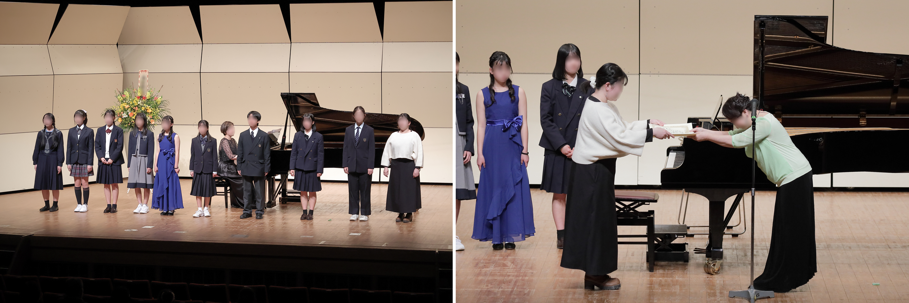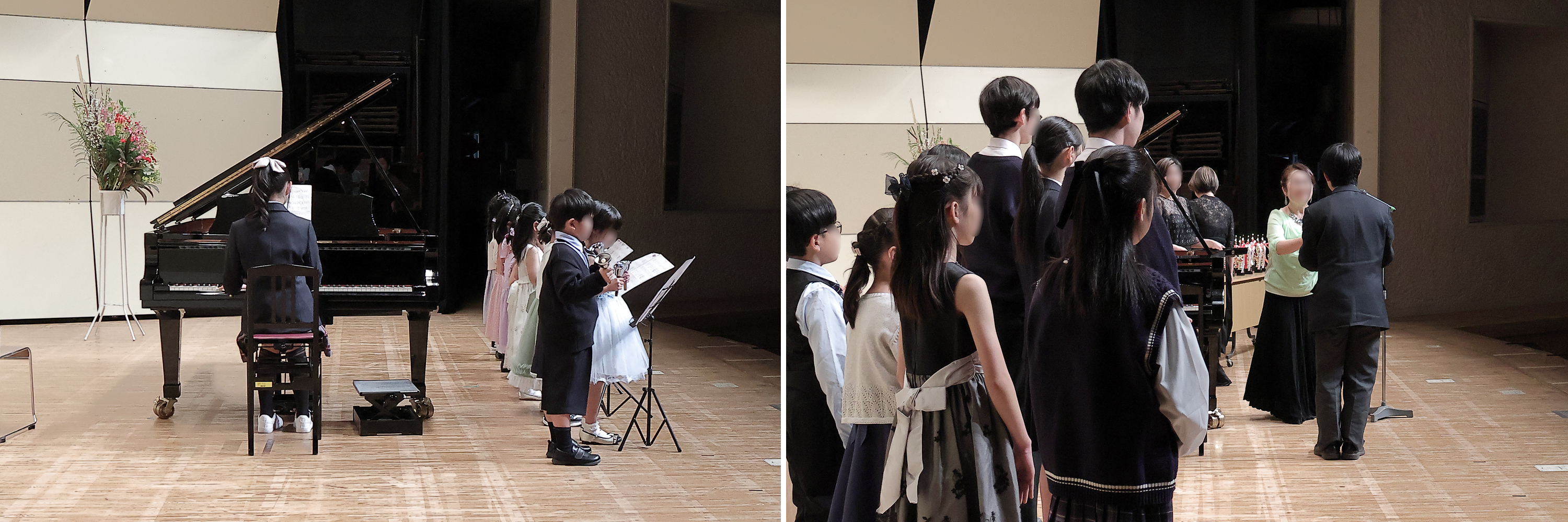 正面~右斜め前から顔の見えやすいアングルで、ピアノとお花など舞台装飾が全て収まるように撮影します。 舞台装飾の位置により撮影範囲も変わりますので、撮影当日に会場での打ち合わせにて確認いたします。