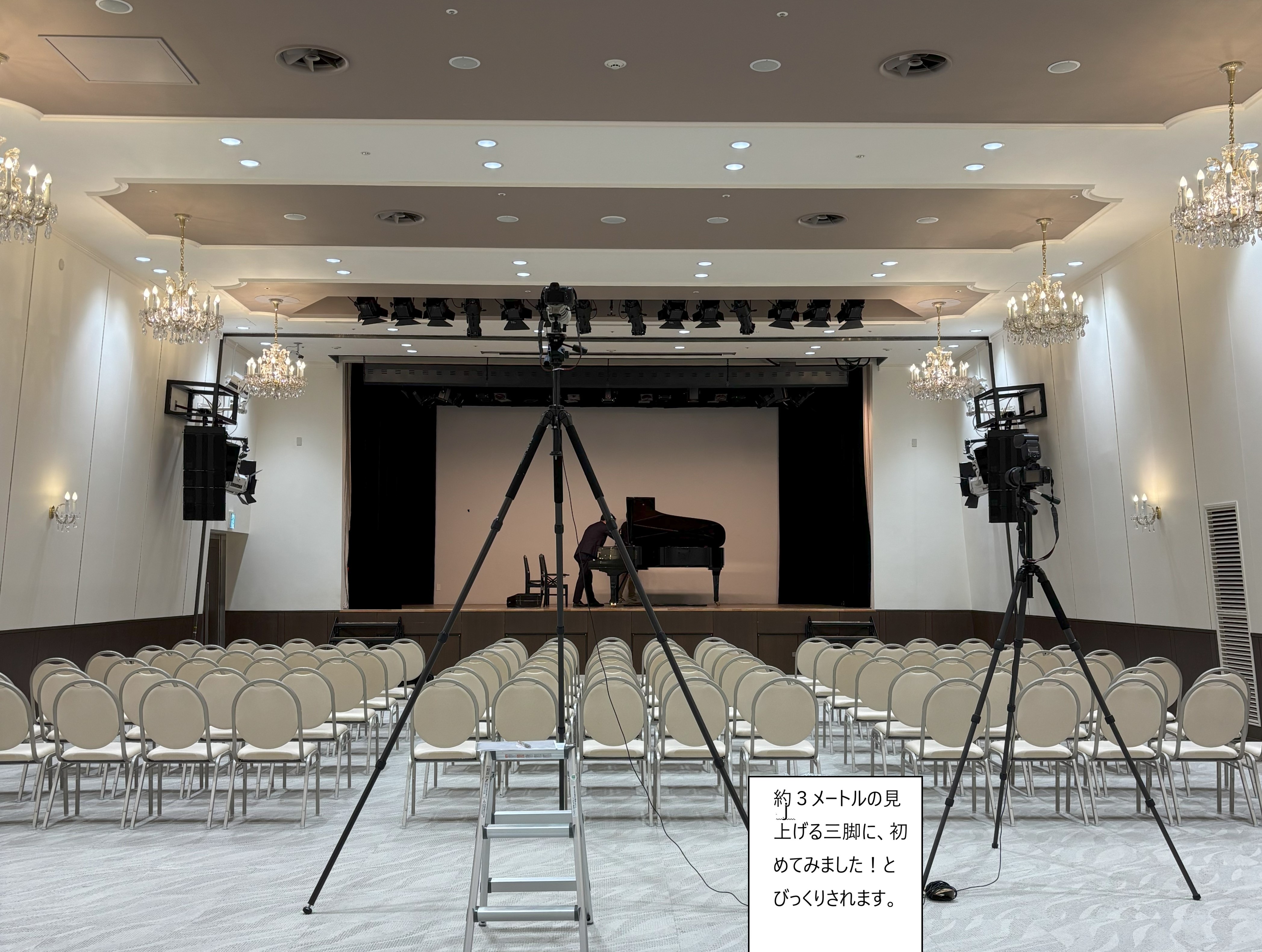 また、舞台と客席の高低差が少ない平らな床の会場でも対応できる約3m対応のプロフェッショナルな三脚で撮影します。